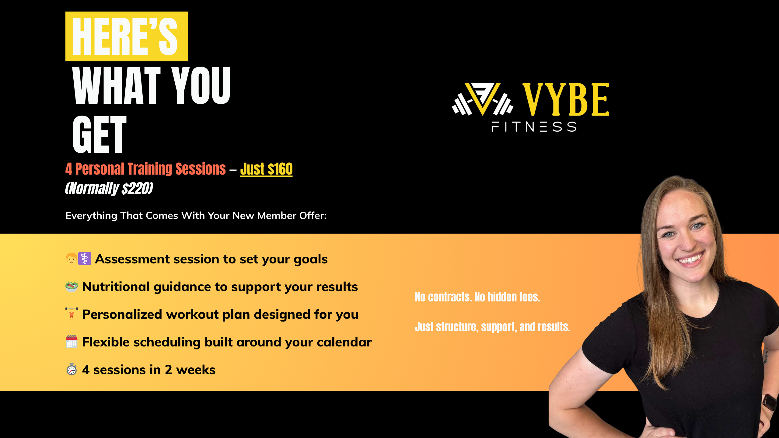 At Vybe Fitness, we give you the structure, accountability, and strength you need to look and feel your best, in just a short time each week. Get stronger, feel better in your clothes, and have the energy to show up fully for the things that matter most.